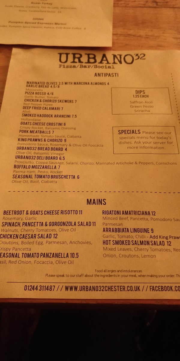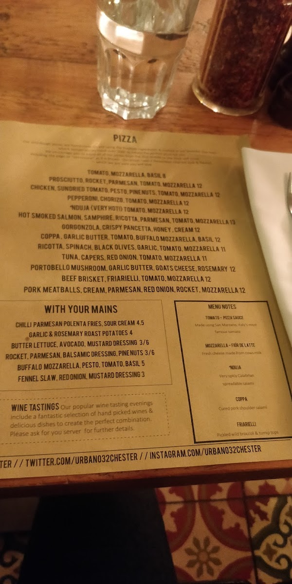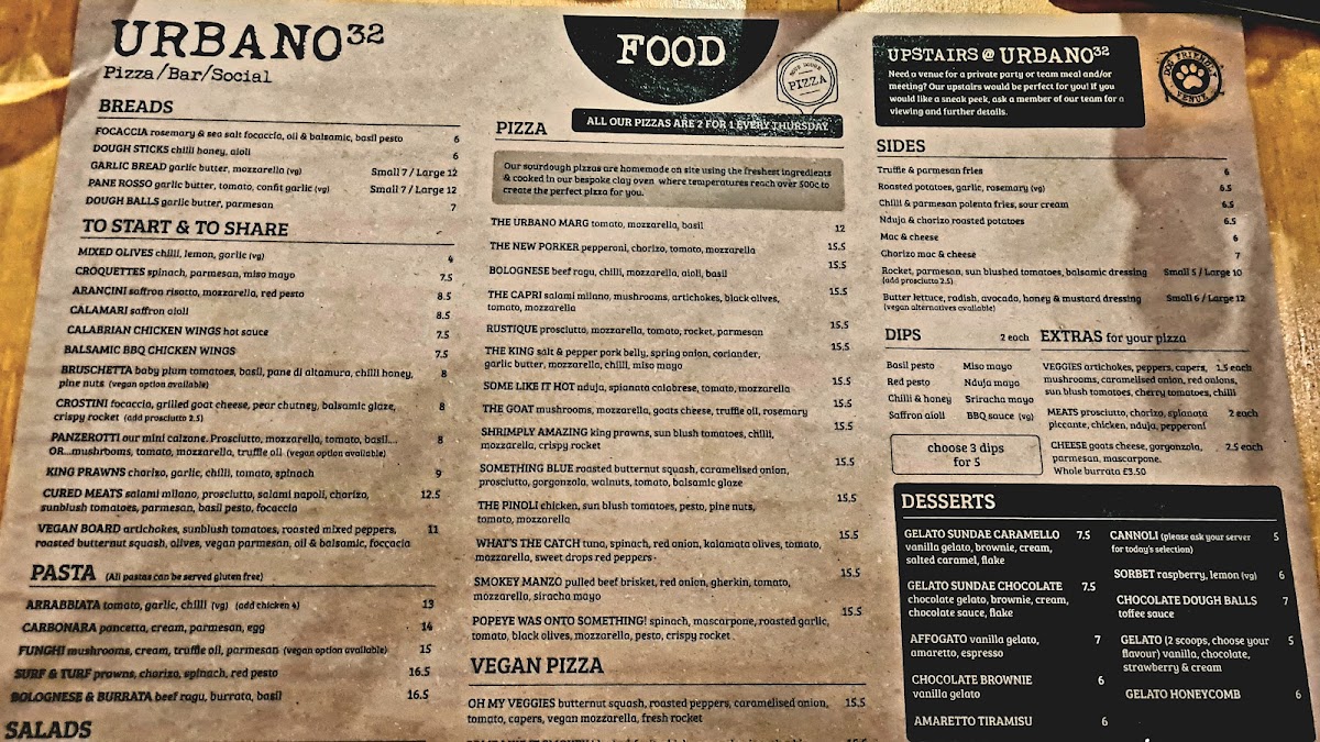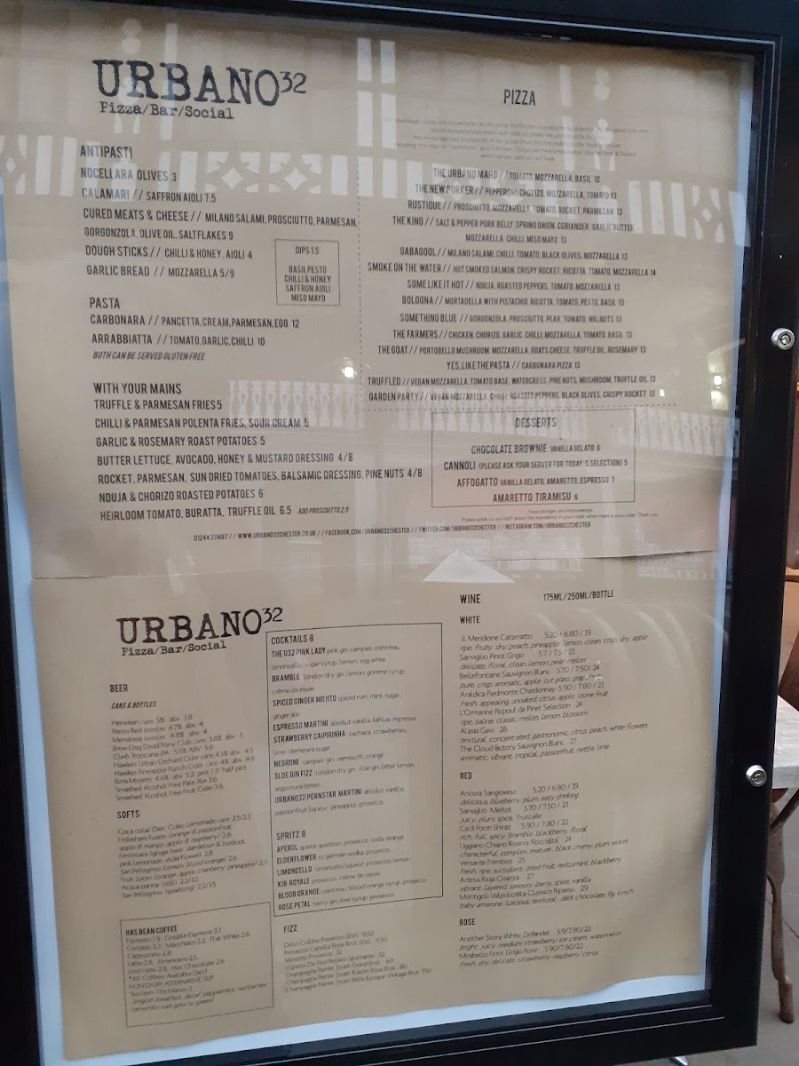 Urbano 32, located at 32 Bridge St, Chester CH1 1NQ, United Kingdom, is a hidden gem offering an exciting culinary experience in the heart of the city. The menu at Urbano 32 stands out for its versatility, balancing traditional Italian flavors with contemporary twists. Whether you’re in the mood for classic wood-fired pizzas, fresh pasta, or unique small plates, Urbano 32 delivers with finesse.